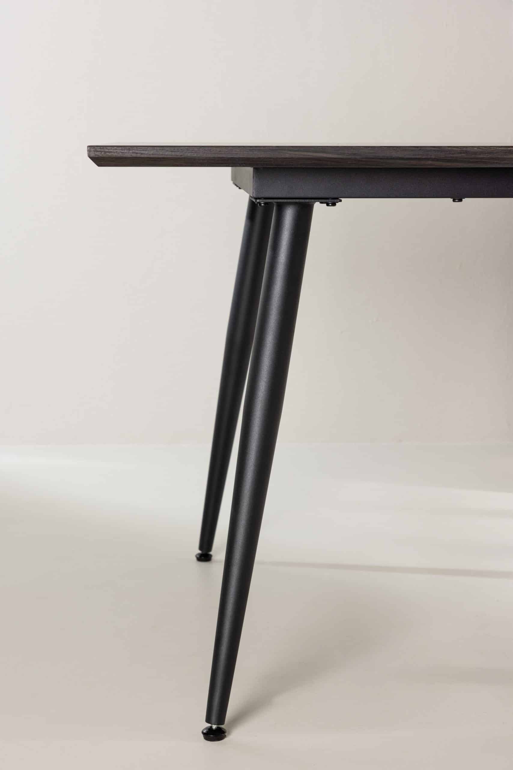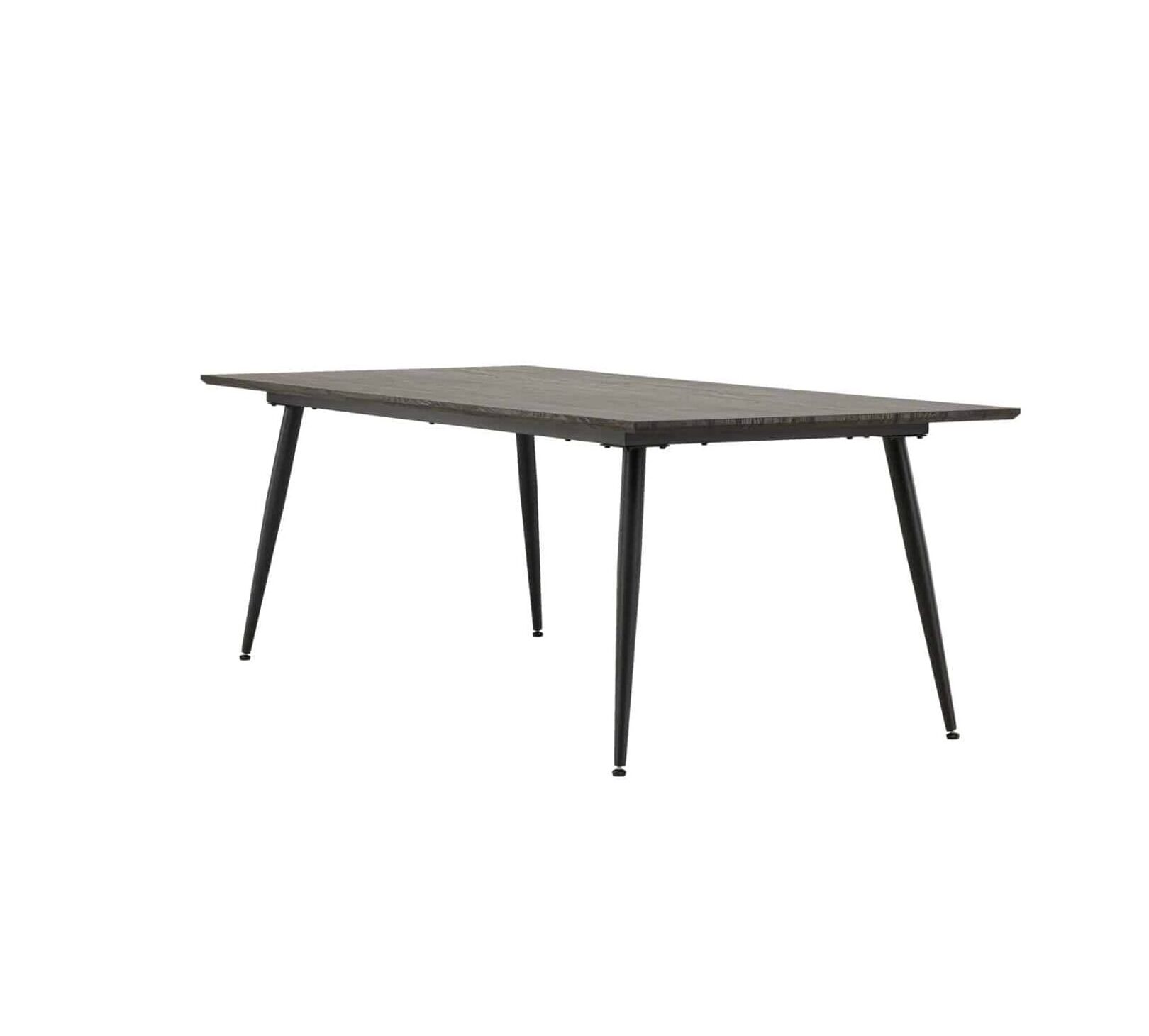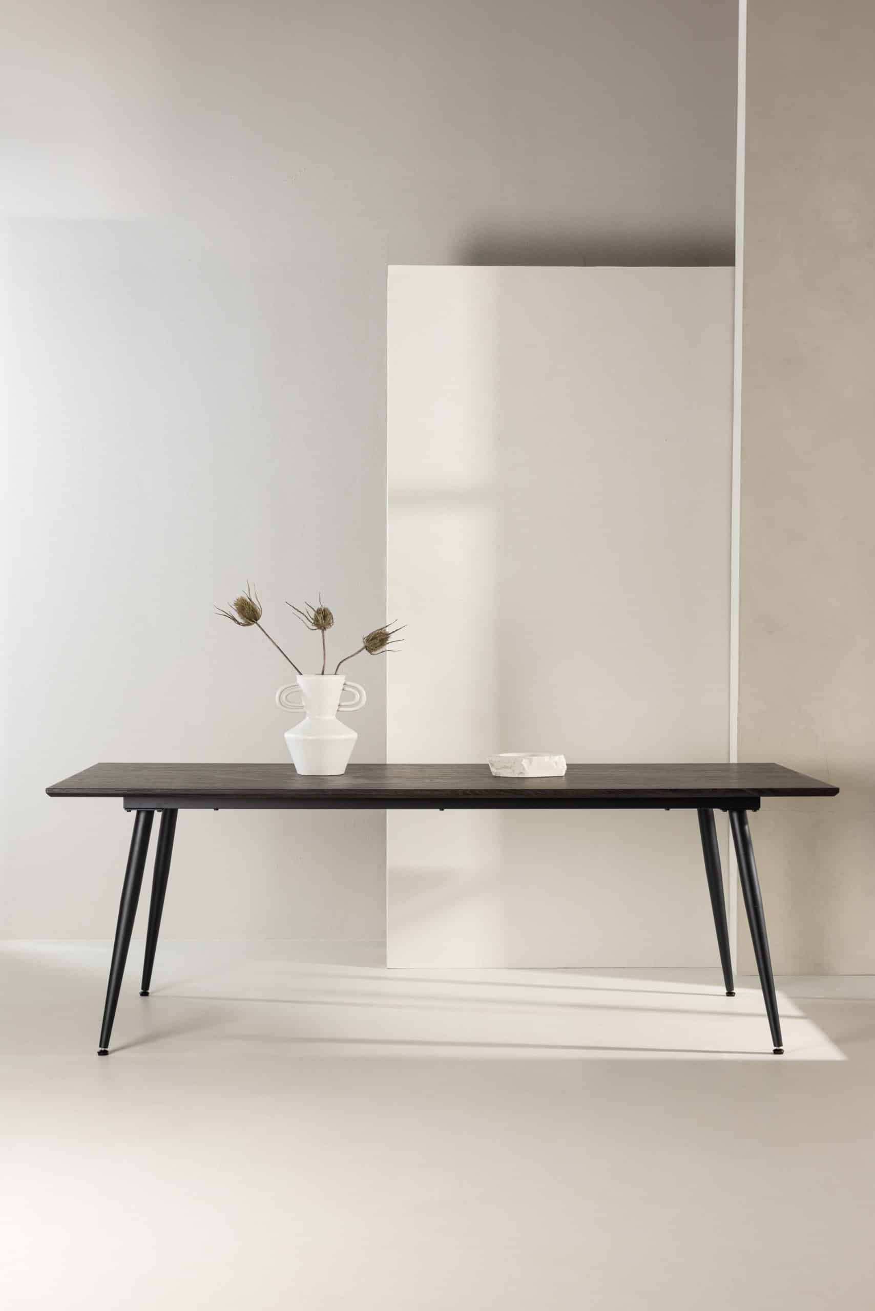De KEHOLMEN eettafel van VENTURE DESIGN combineert royale schaal met verfijnd gemak. Een warmbruin rechthoekig MDF-blad (220×100 cm) rust op zwarte stalen poten; strak, stevig en gastvrij. Van familiediners tot laptopochtenden, hier worden alledaagse momenten met een gerust hart verzameld.