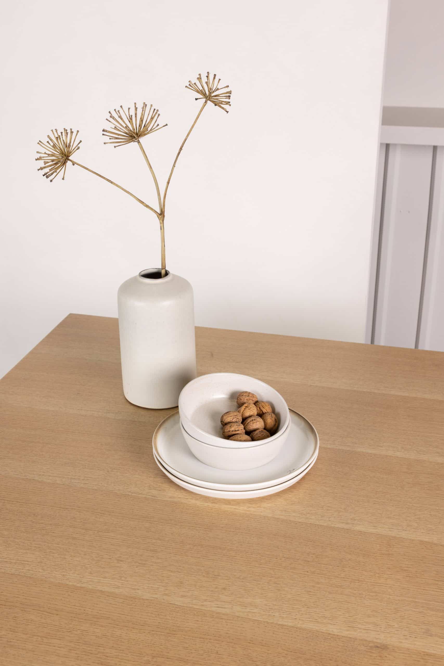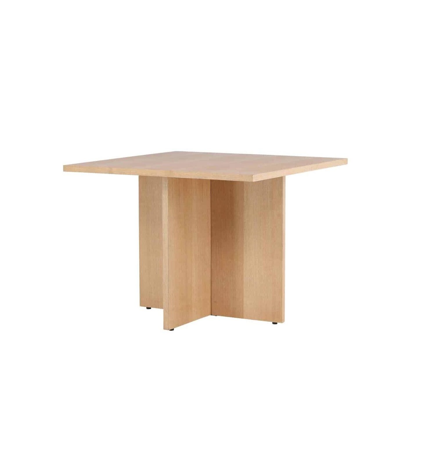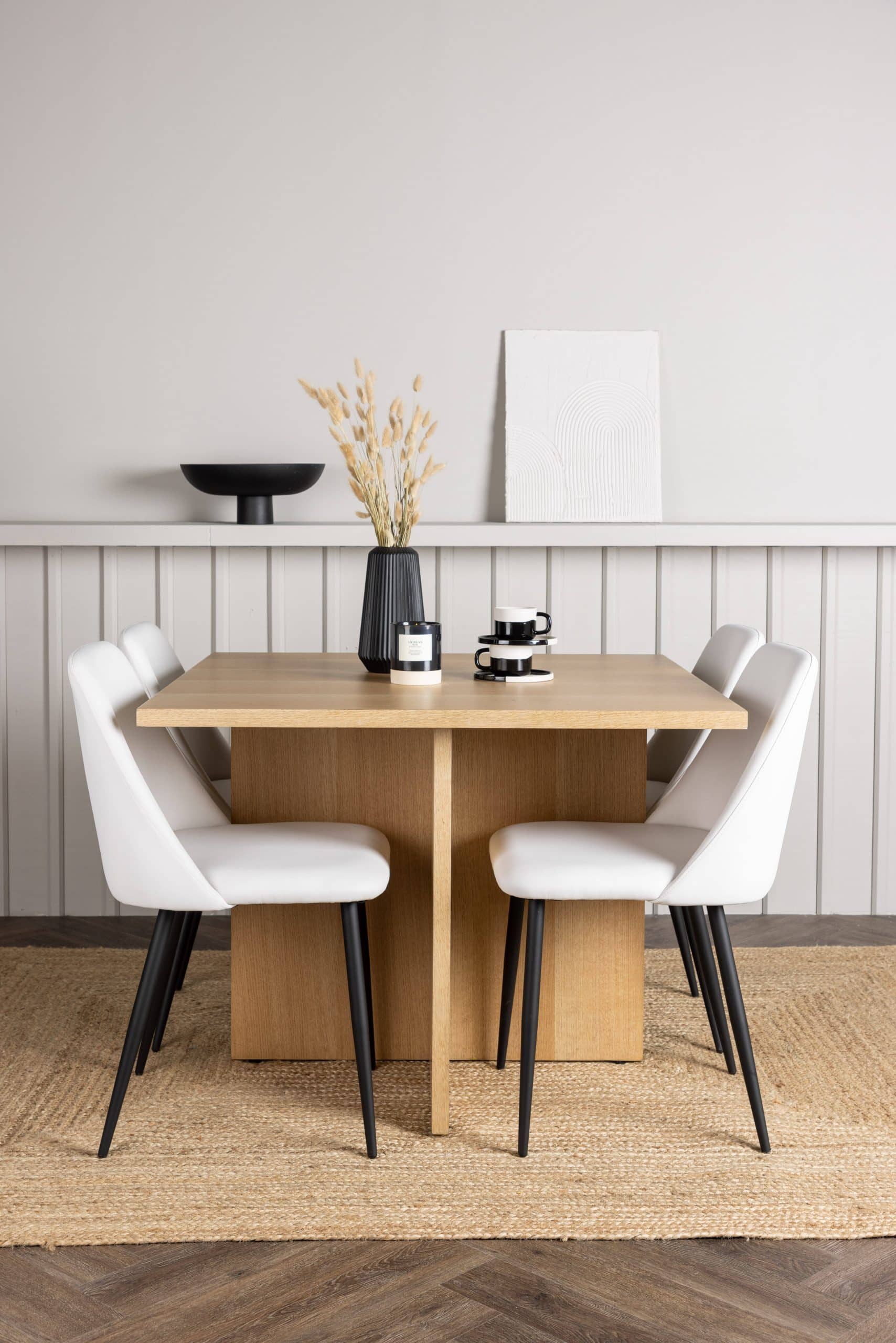 De LEO eettafel van VENTURE DESIGN combineert klassieke lijnen met een modern tintje. Een vierkant eikenkleurig MDF-blad zit op een kriskras onderstel; compact, stevig en rustig verfijnd. Perfect voor kleinere keukens, het maakt van dagelijkse maaltijden weloverwogen momenten.