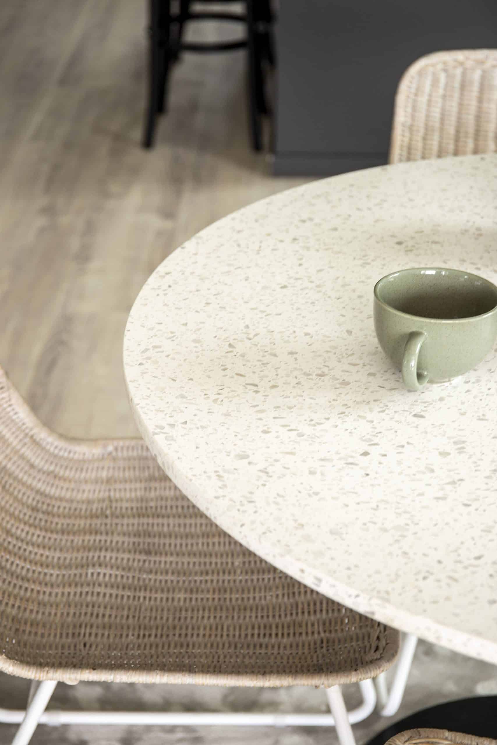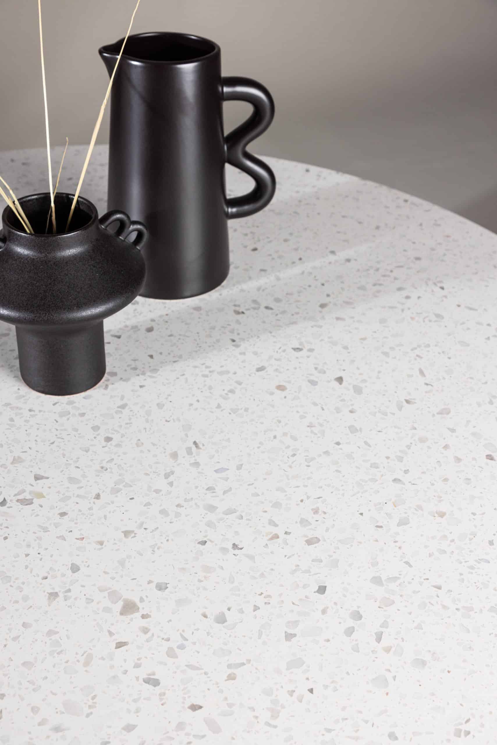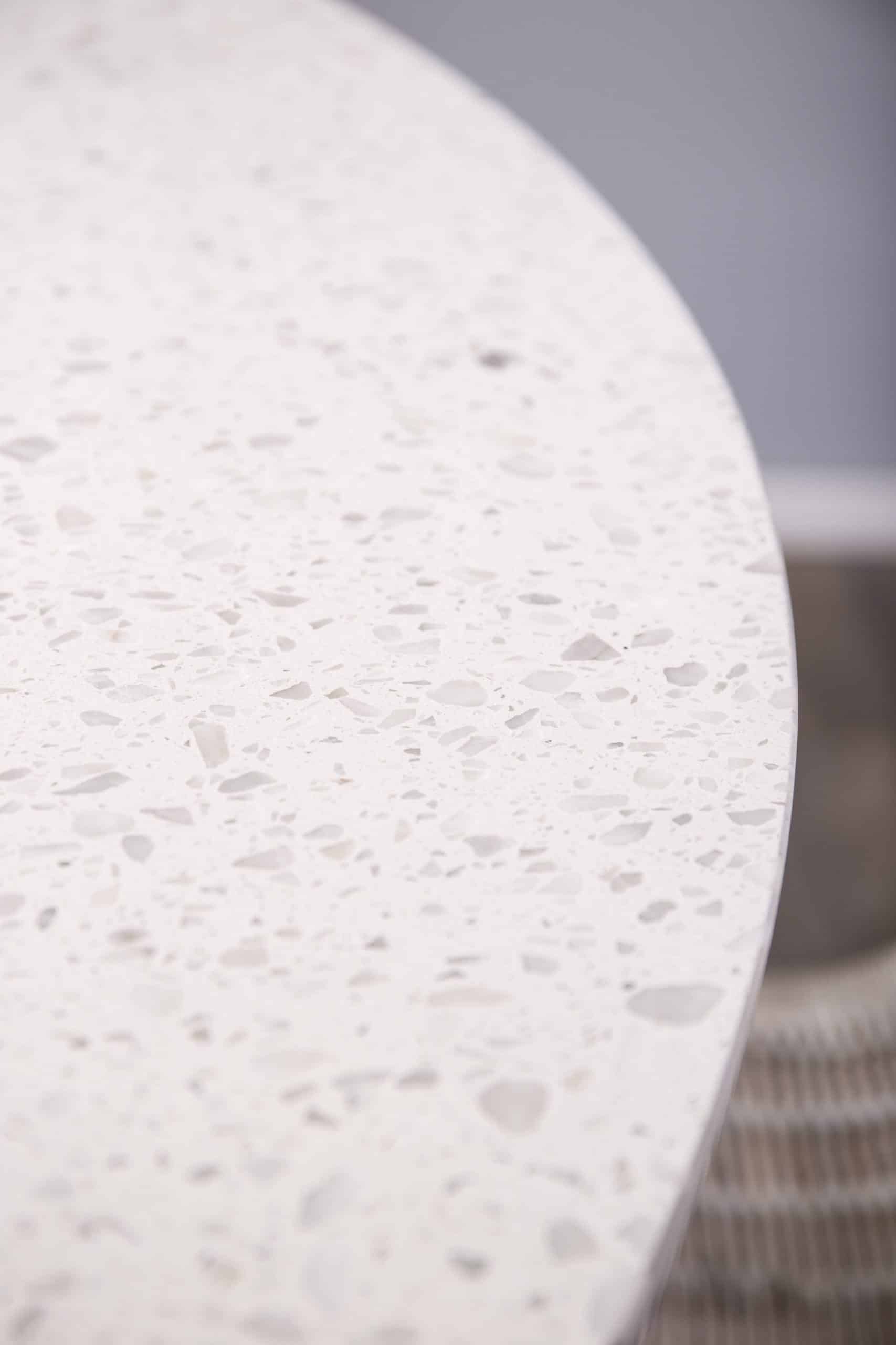 Bovenblad: Terrazzo tafelblad met natuursteenchips in een glad, afgedicht oppervlak; Het slanke profiel van 2 cm voelt solide en verfijnd aan.